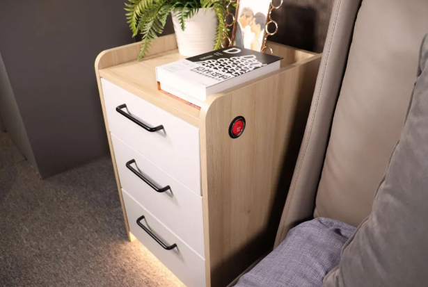 其中,康小金适老智能安全床头柜S1内嵌一键紧急呼救系统的适老床头柜,搭配智能网关,除了线下报警呼救,还能直接给紧急联系人拨打电话呼救,让居家生活多一重保障,少一点意外。在柜体部分,考虑到使用者可能出现身体不适的状况,将柜体高度加高至70CM,辅以4.2cm高的三面围挡,让使用者起床、行动有处借力,更加轻松;床头柜底部添加智能感应夜灯,柔和的光线不刺眼、不影响同寝人,让起夜更安心;而柜体材质采用了更安全的无醛添加“纯净板”,环保更健康。除此之外,圆弧形防磕碰边角设计、内嵌防泼溅插座等多项贴心设计,每一处细节都照顾到位。